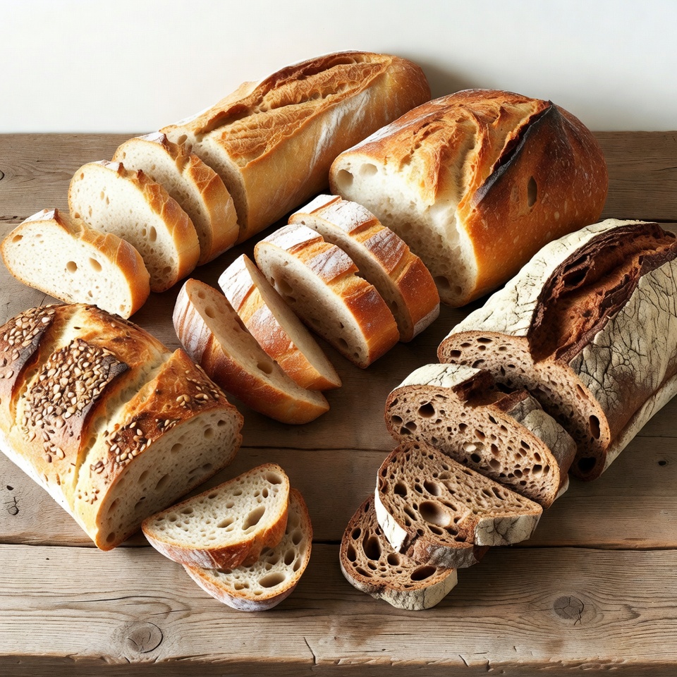 artisan bread, baguette, baked goods, bakery, baking, bread assortment, bread slices, crusty bread, food photography, fresh bread, golden crust, loaf bread, loaves, rustic bread, seeded bread, sliced bread, soft interior, white bread, wooden table, bread