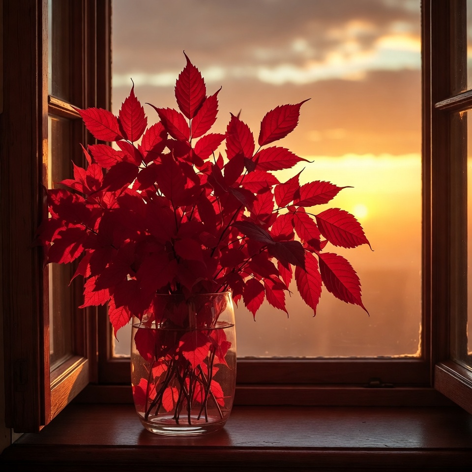 autumn leaves, backlit, bouquet, clouds, fall foliage, glass vase, golden hour, indoor, nature, plant, red foliage, sky, still life, sunlight, sunset, vase, warm light, window, windowsill, wooden sill, red leaves