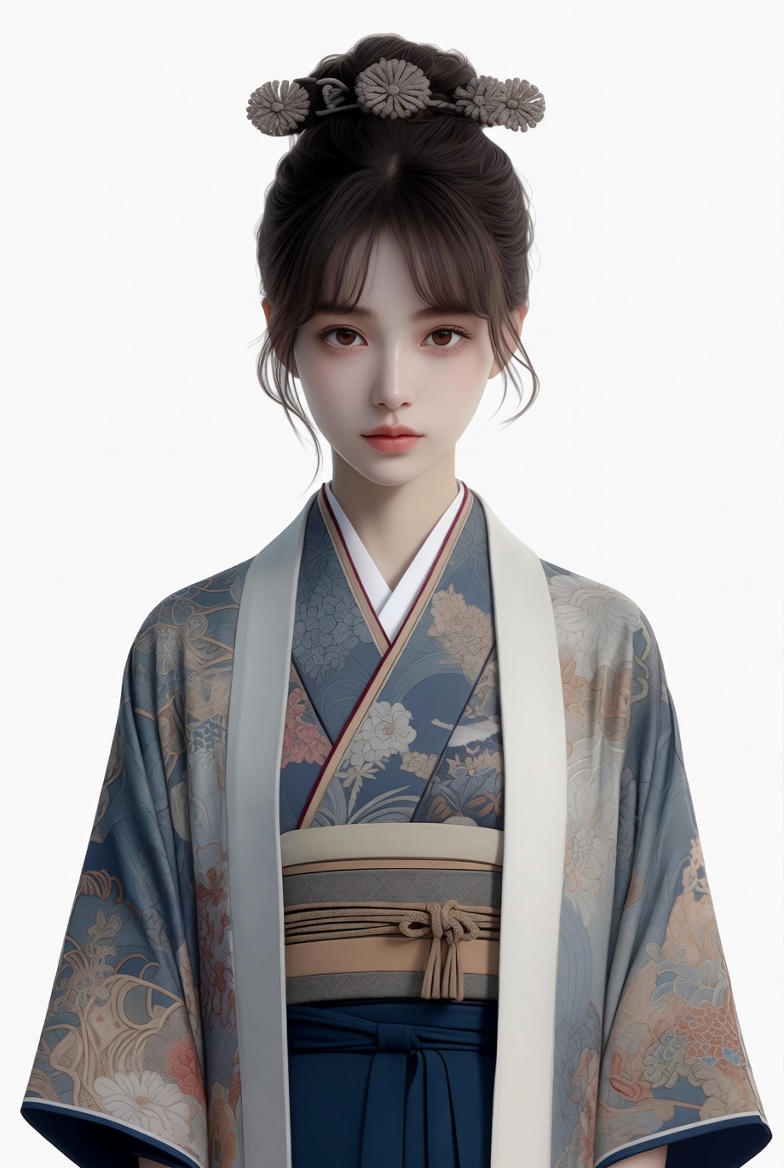 A young Asian woman with black hair styled in an elegant updo topped with a fluffy ornament stands gracefully. She wears a traditional blue kimono with intricate floral patterns, white collar, and wide obi sash. The image is rendered in a detailed 3D illustration style against a plain background.