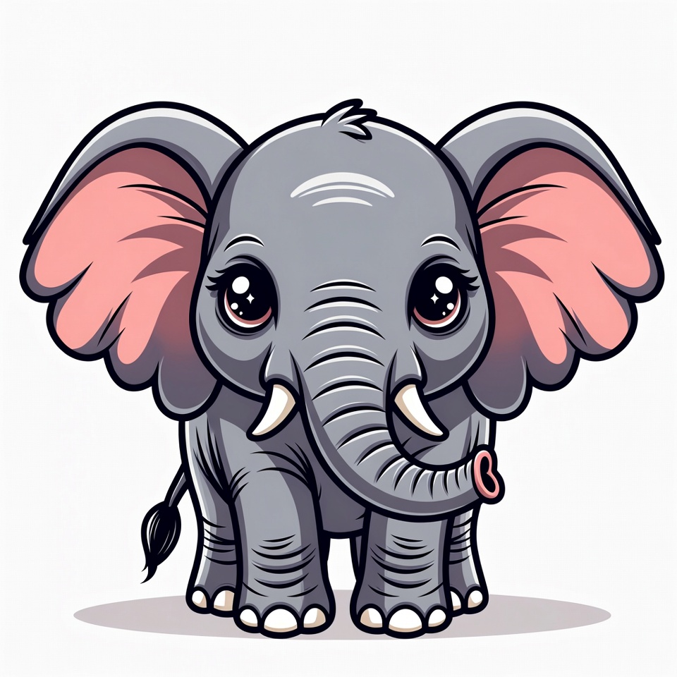 A kawaii-style cartoon baby elephant with large pink ears and sparkling eyes stands on a white background. The gray elephant has a small trunk, tiny tusks, and a short tail. Its feet are wide and detailed with white toenails.