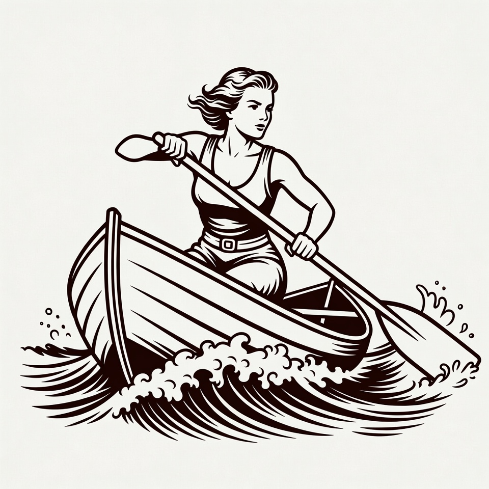 A woman with flowing hair rows a canoe vigorously through choppy waves. She wears a tank top and shorts, gripping the paddle with both hands. The scene is rendered in a bold black line art illustration style on an isolated white background.