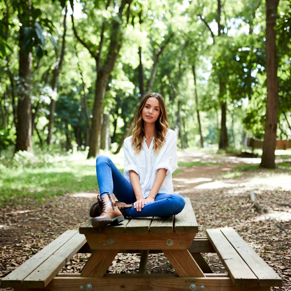 White, blue jeans, brown boots, brown hair, button shirt, casual pose, forest, green forest, leather boots, legs crossed, nature, outdoor, park, path, picnic table, serene woods, sitting, sunlight, trail, trees, wavy hair, white shirt, wooden table, young woman, woman