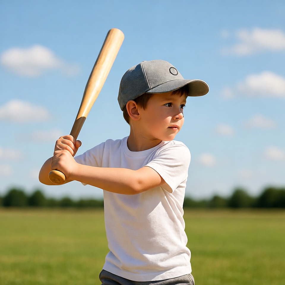 A young boy with short brown hair wears a gray cap, white t-shirt, and gray shorts while swinging a wooden baseball bat. He stands in a green field under a clear blue sky with scattered white clouds. His expression is focused as he grips the bat with both hands.