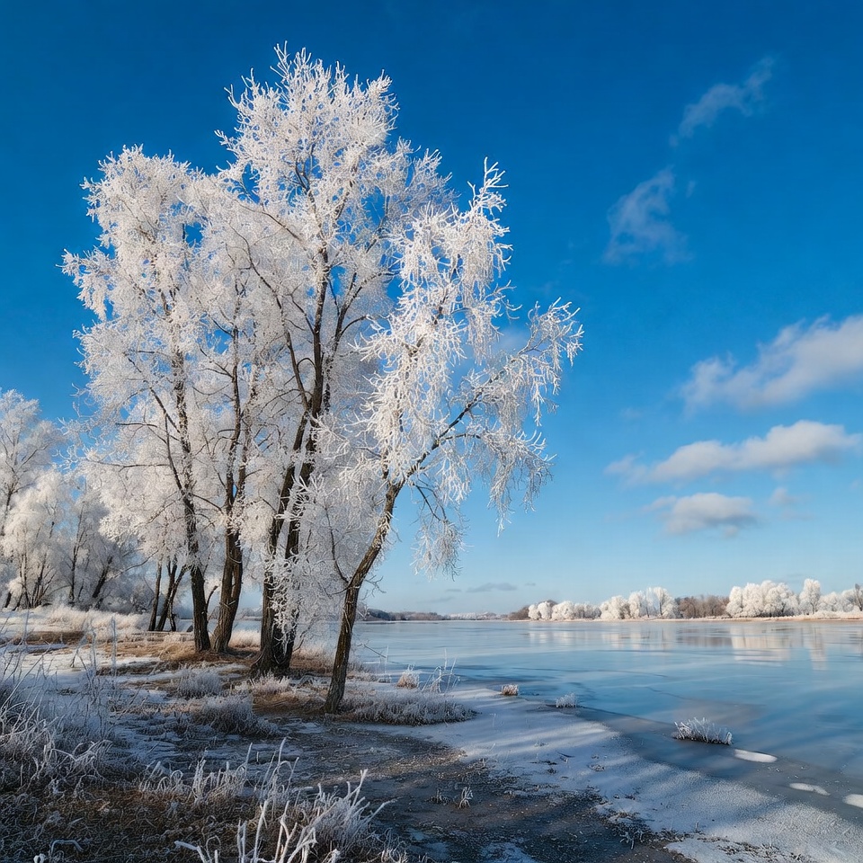A cluster of trees covered in white frost stands along the snowy bank of a frozen river. The sky is bright blue with scattered white clouds, and the ice on the water reflects the clear winter light. Snow dusts the ground and grasses near the shore.