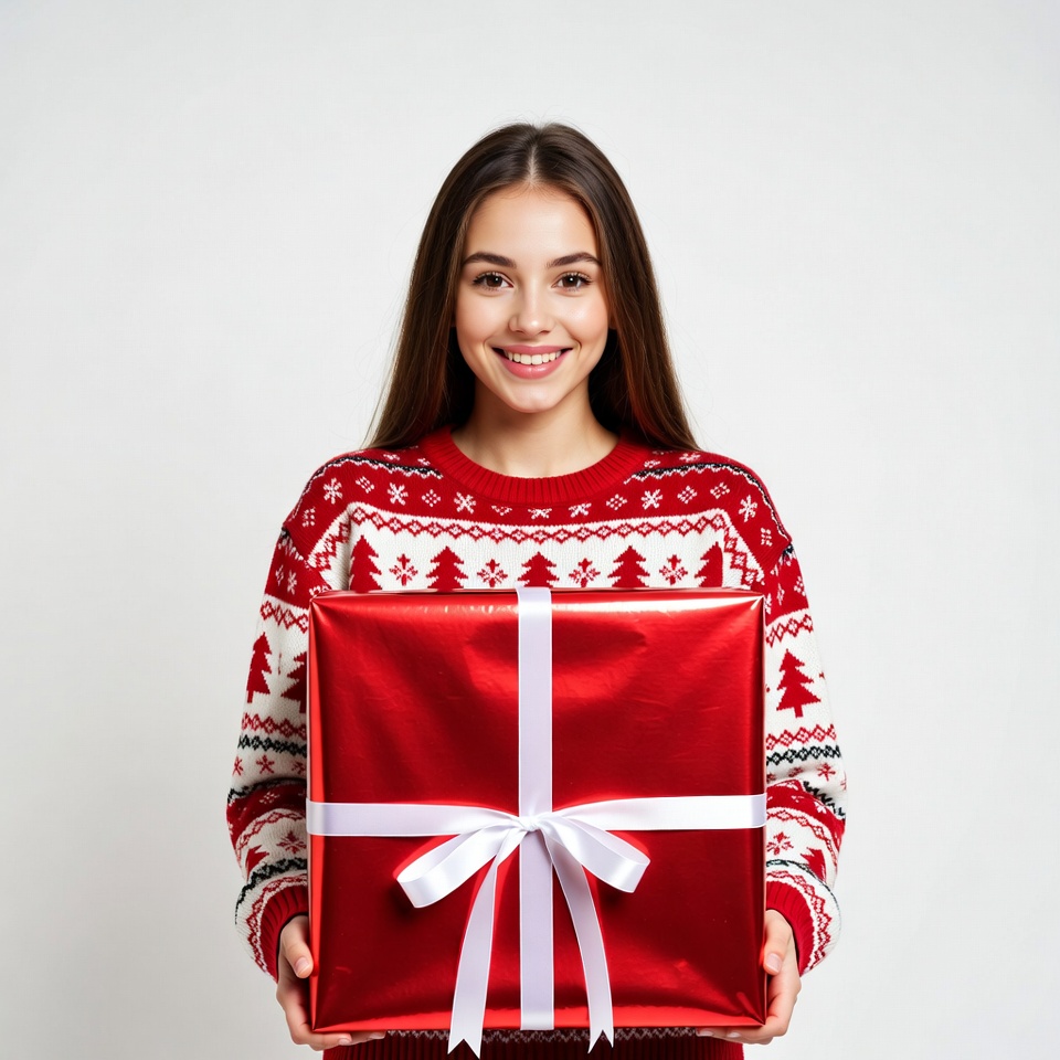 Christmas gift, Christmas sweater, brown hair, female, festive outfit, holding gift, holiday gift, red gift box, red sweater, smiling, snowflake pattern, white background, white ribbon, young woman, woman