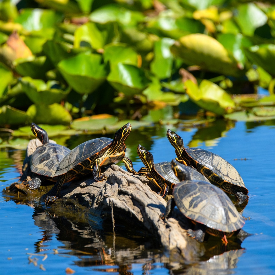 animals, aquatic, blue water, freshwater turtles, green leaves, lily pads, log, multiple turtles, natural habitat, nature, outdoor, pond, red-eared slider, reflections, reptiles, slider turtles, striped pattern, turtle cluster, turtle group, turtle shell, water, wildlife, turtles