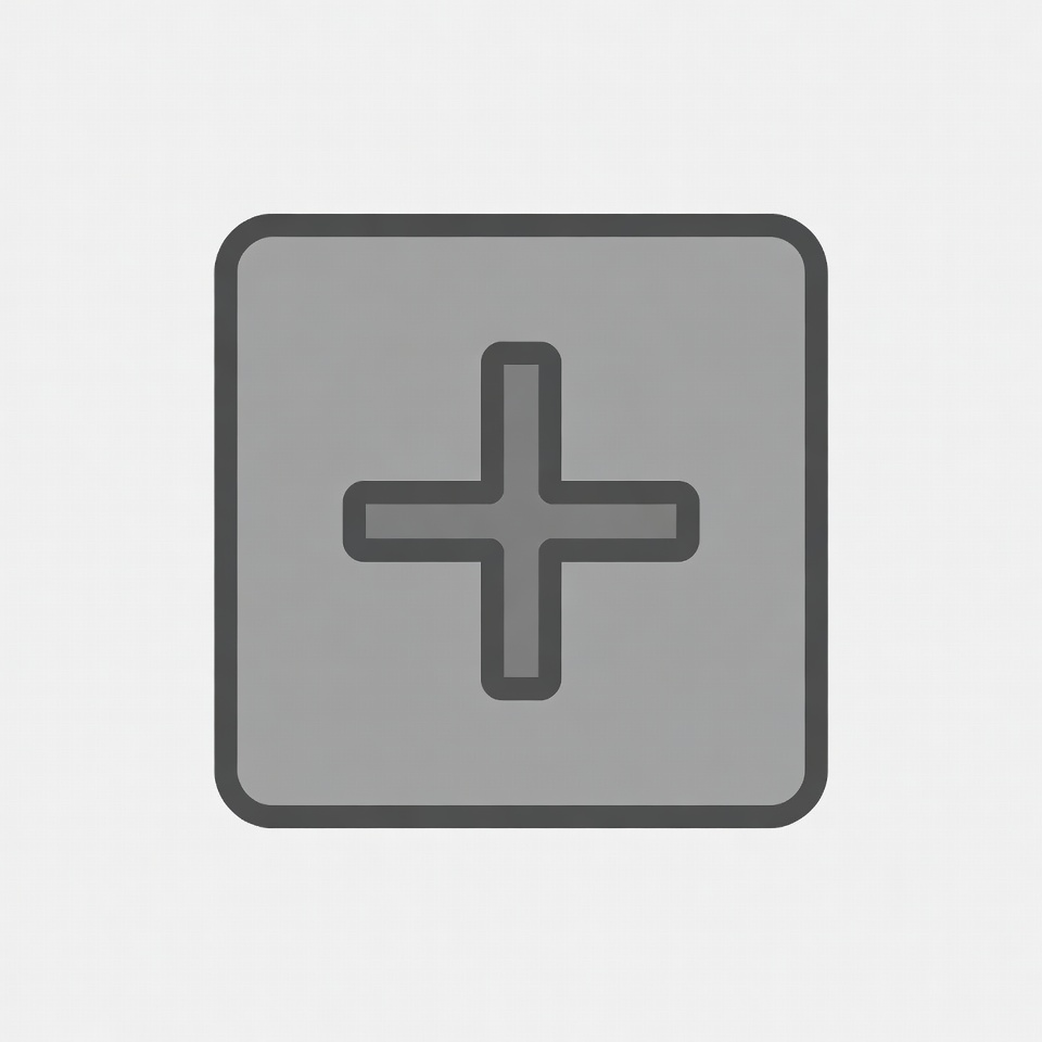 A simple gray plus sign symbol is centered on a square gray background. The icon features thick black outlines and a flat design style. It is isolated against a white backdrop.