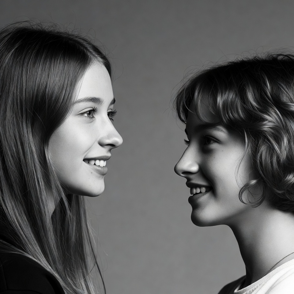 Two young women with long brown hair face each other in profile on a gray background. The woman on the left wears a black top, while the one on the right wears a white top. Both display gentle smiles with subtle makeup.