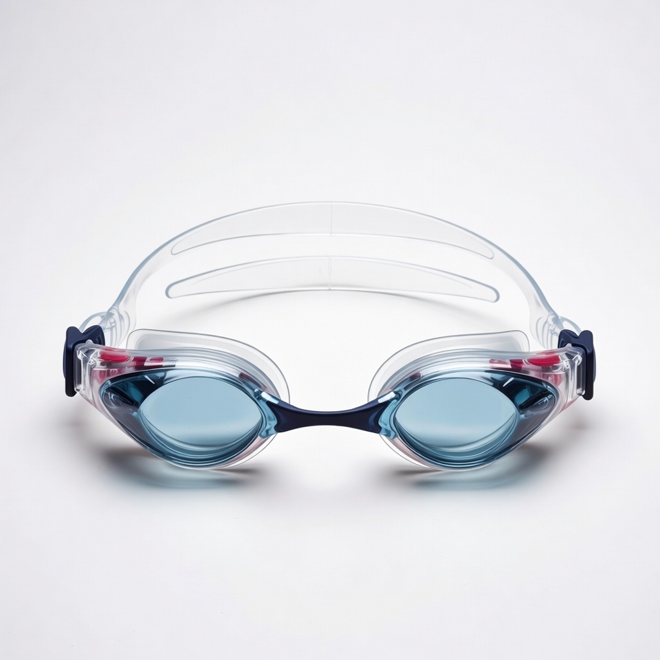 adjustable strap, aquatic gear, blue goggles, clear lenses, goggles, isolated background, navy frame, pool goggles, red accents, sports equipment, swim mask, swimming gear, swimwear, waterproof goggles, swimming goggles
