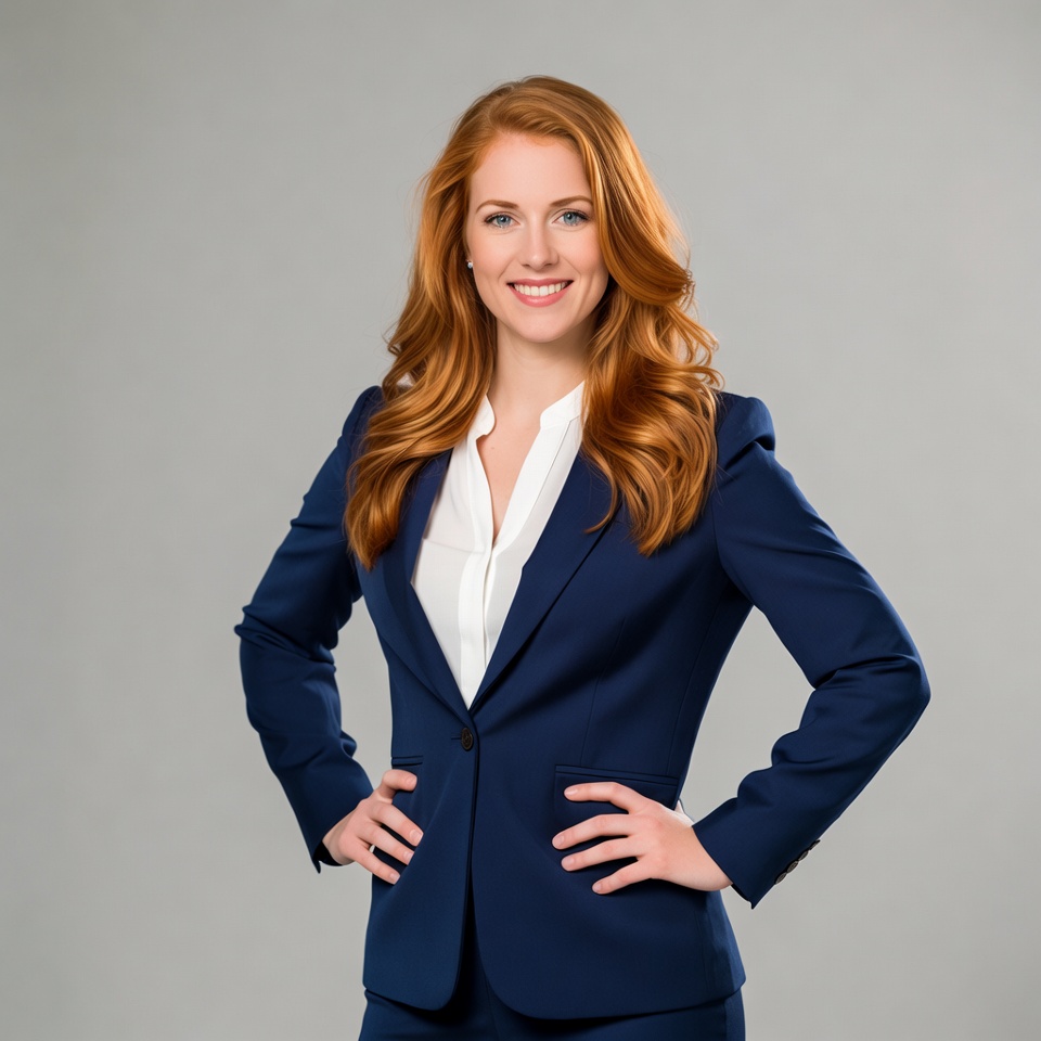 A woman with long red hair smiles confidently at the camera while standing with hands on hips. She wears a navy blue blazer over a white collared shirt. The image features a plain gray background.