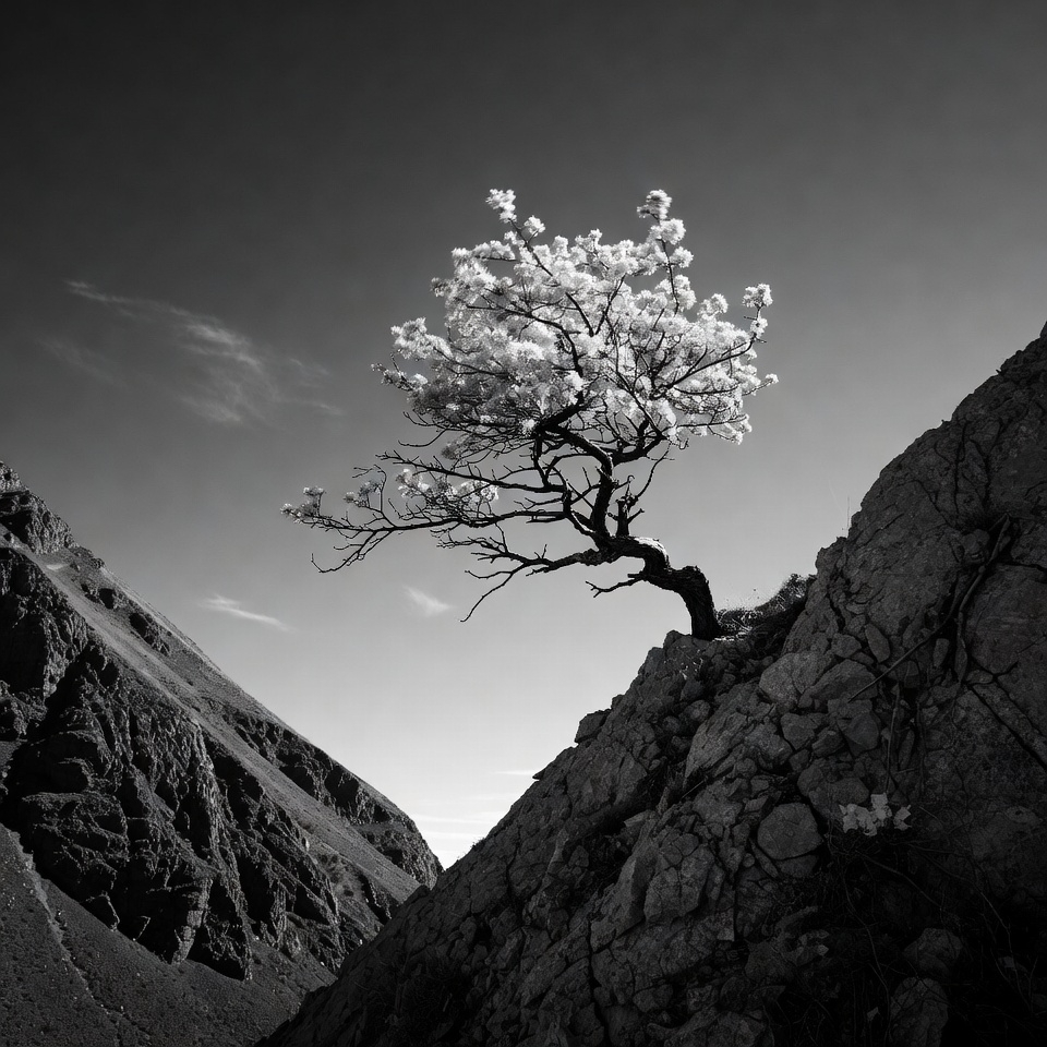A lone tree with white blossoms grows dramatically from a rocky cliff between steep mountain slopes. The black and white photograph captures the tree's twisted branches against a cloudy sky and rugged terrain. Sparse rocks and distant peaks frame the isolated tree.