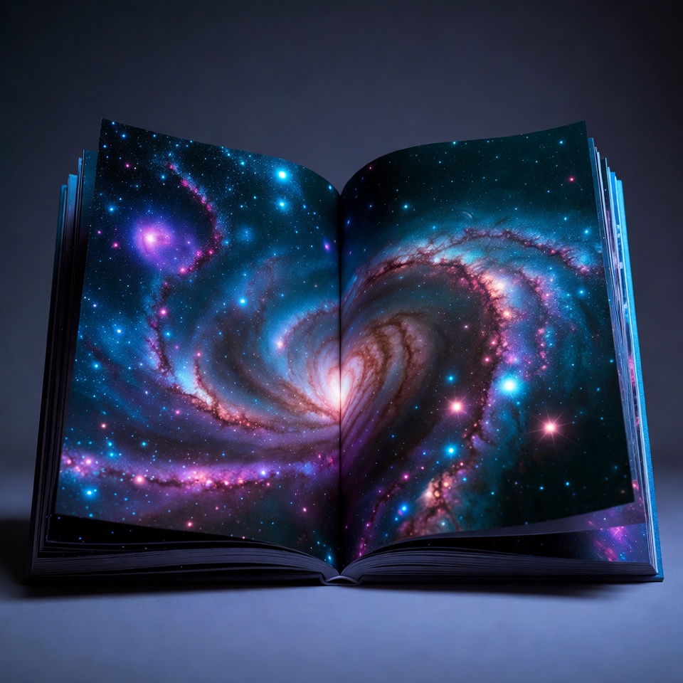 An open book displays a vibrant heart-shaped galaxy inside its pages, featuring swirling purple, pink, and blue nebulae and stars. The cosmic scene forms a spiral galaxy with a glowing heart at the center. The book rests on a dark gradient background.