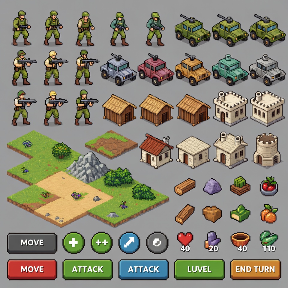 UI buttons, army men, attack button, castles, end turn, game assets, grass, houses, huts, illustration, isolated background, jeeps, level up, military, move button, rifles, rocks, soldiers, terrain, trees, vehicles, pixel art
