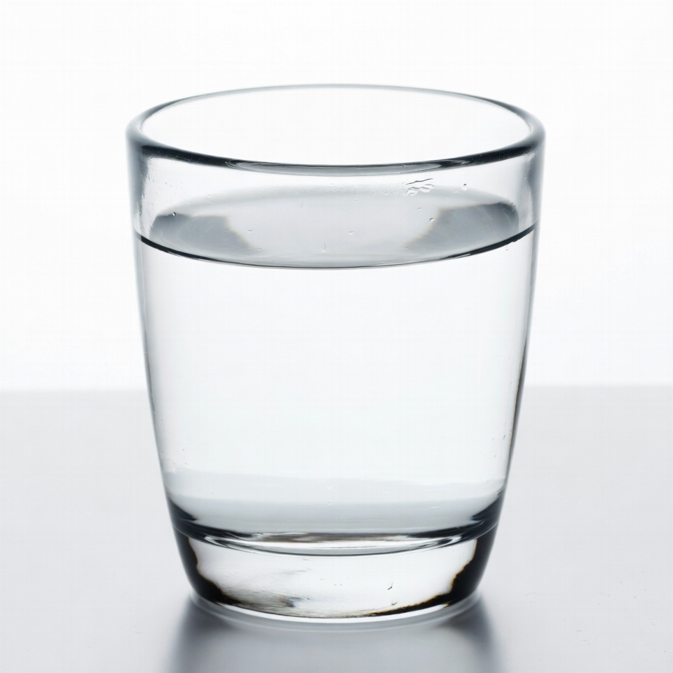A clear glass tumbler filled with water sits on a white surface. The glass has straight sides and a slight reflection on the bottom. It is isolated against a plain white background.