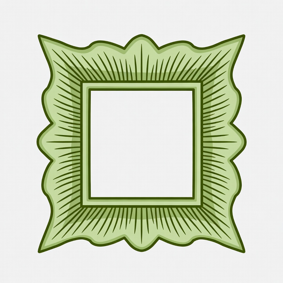 A vector illustration of a green ornate picture frame with intricate scalloped edges and radiating lines. The frame features pointed corners and a simple square opening in the center. It is isolated on a white background.