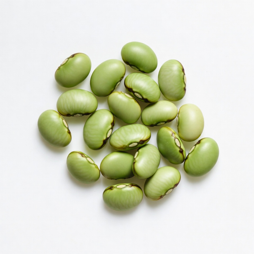 A cluster of fresh green beans with dark hilums is arranged on a plain white background. The beans are smooth, vibrant green, and slightly glossy. They are grouped closely together in an informal pile.