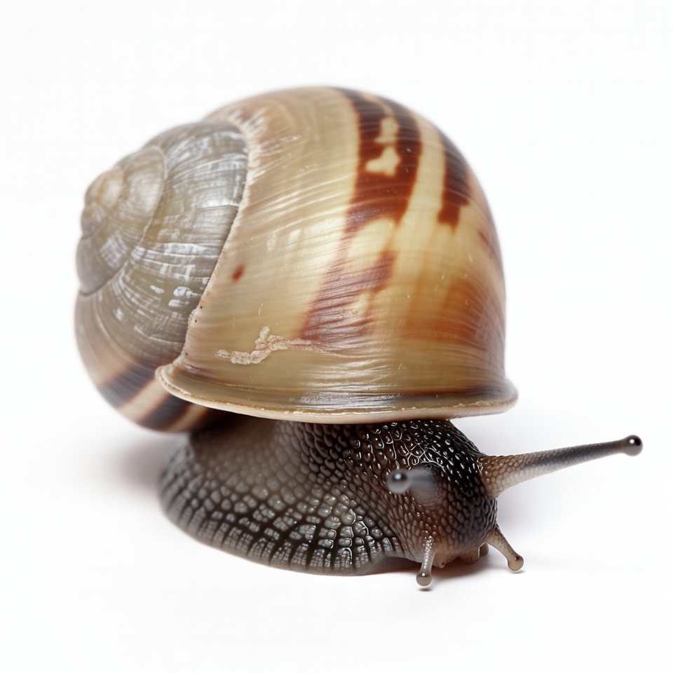 animal, antennae, brown shell, close-up, garden snail, isolated, macro photography, mollusk, shell, spiral shell, textured body, white background, wildlife, snail