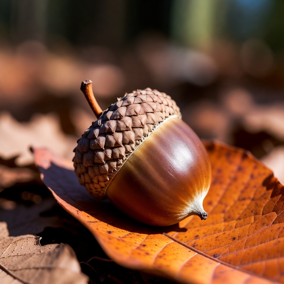 A single brown acorn with a textured cap rests on a large orange autumn leaf. The acorn features a small stem and shiny surface, set against a blurred forest background. Surrounding fallen leaves enhance the fall forest scene.