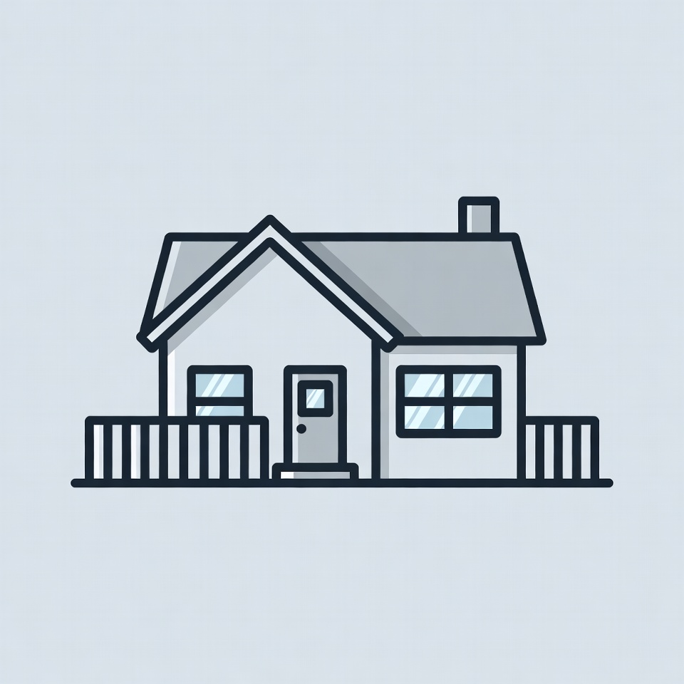 A minimalist line art illustration of a house features a gabled roof, chimney, front door, and two windows. It includes a small porch with railings and steps. The drawing is rendered in gray tones on a light gray background.
