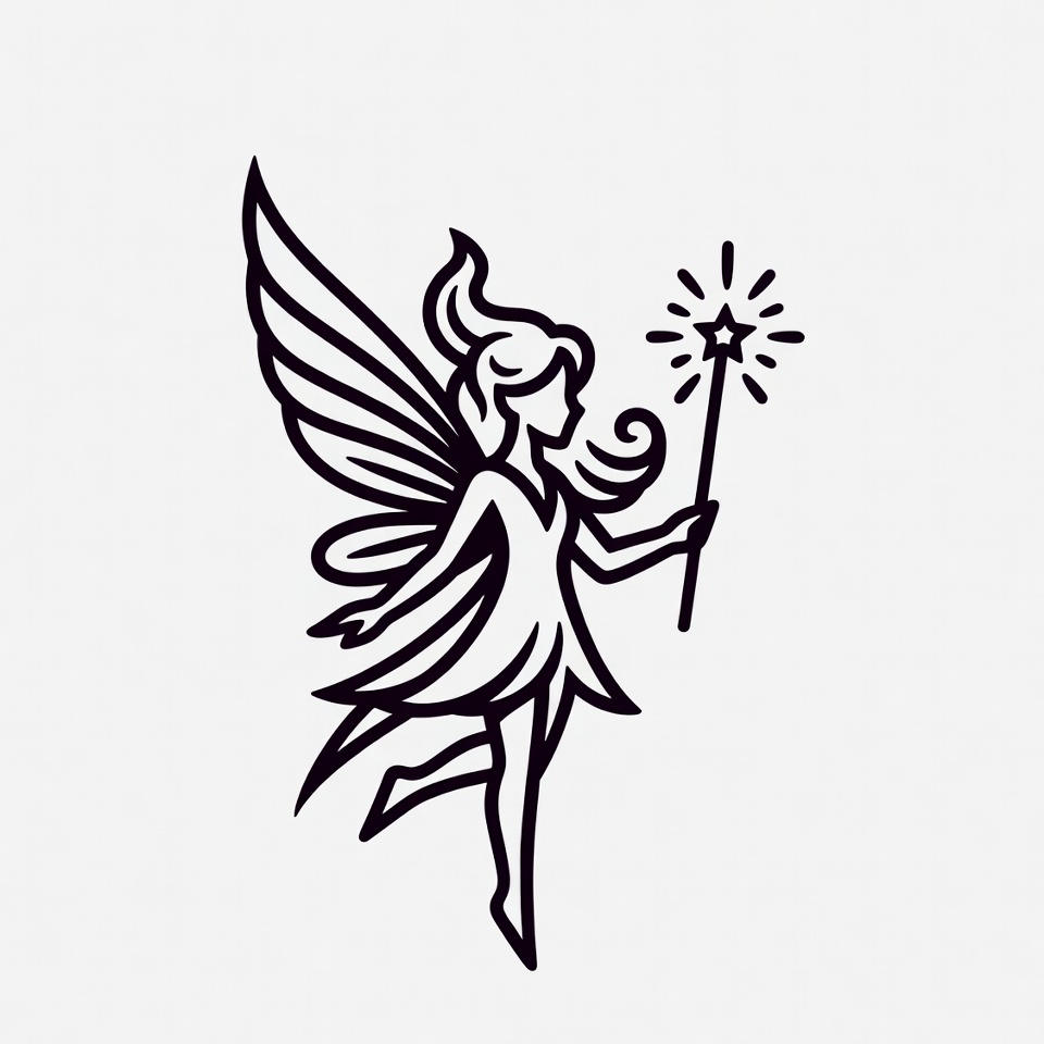 A black line art illustration of a fairy with large wings holds a sparkling magic wand. She has flowing hair, a dress, and is posed dynamically with one leg lifted. The design features clean outlines on a white background.