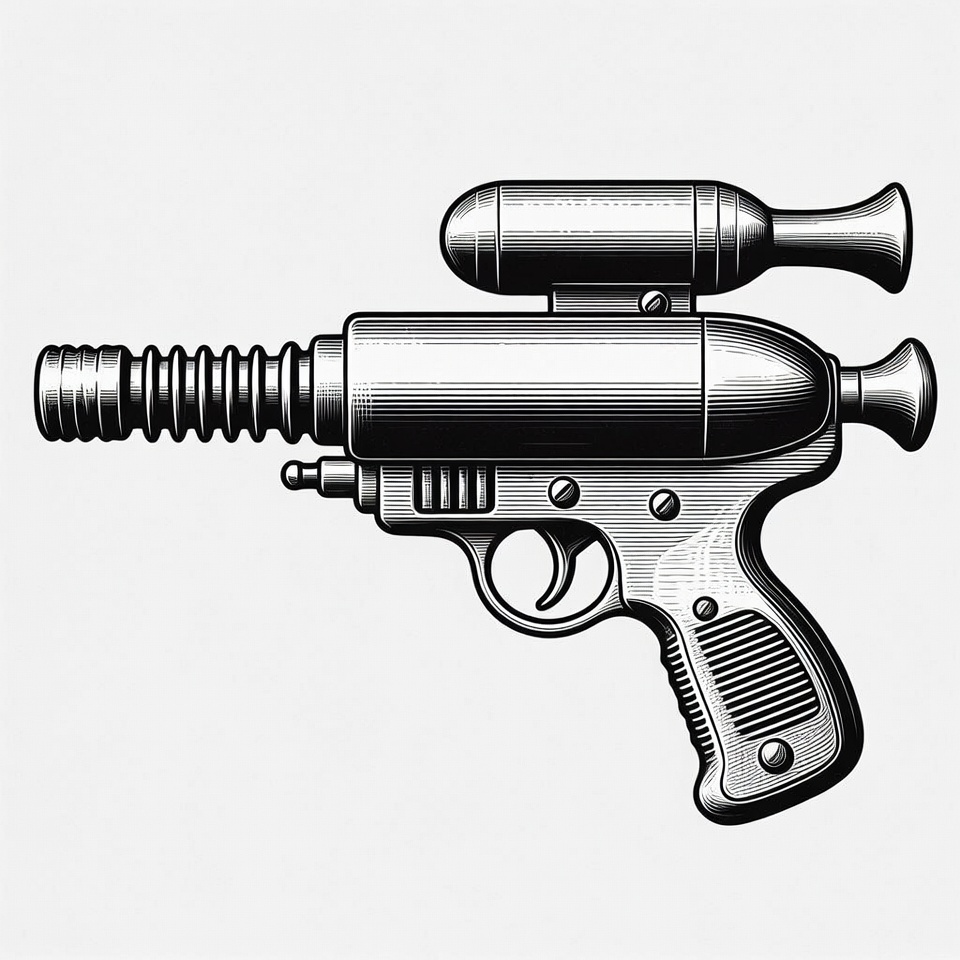 blaster, clipart, engraving style, futuristic weapon, handgun, illustration, isolated background, laser gun, line art, pistol, retro gun, sci-fi gun, space gun, vintage sci-fi, weapon illustration, ray gun