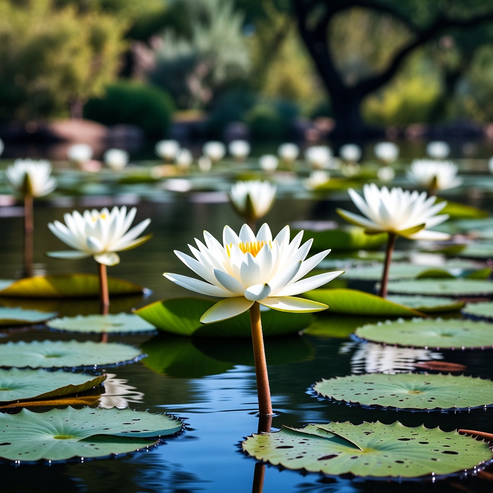 aquatic plants, blooming flowers, flower cluster, garden, green leaves, lily pads, lush greenery, nature, pond, serene pond, trees, water lilies, water reflection, white lotus, yellow centers, lotus flowers