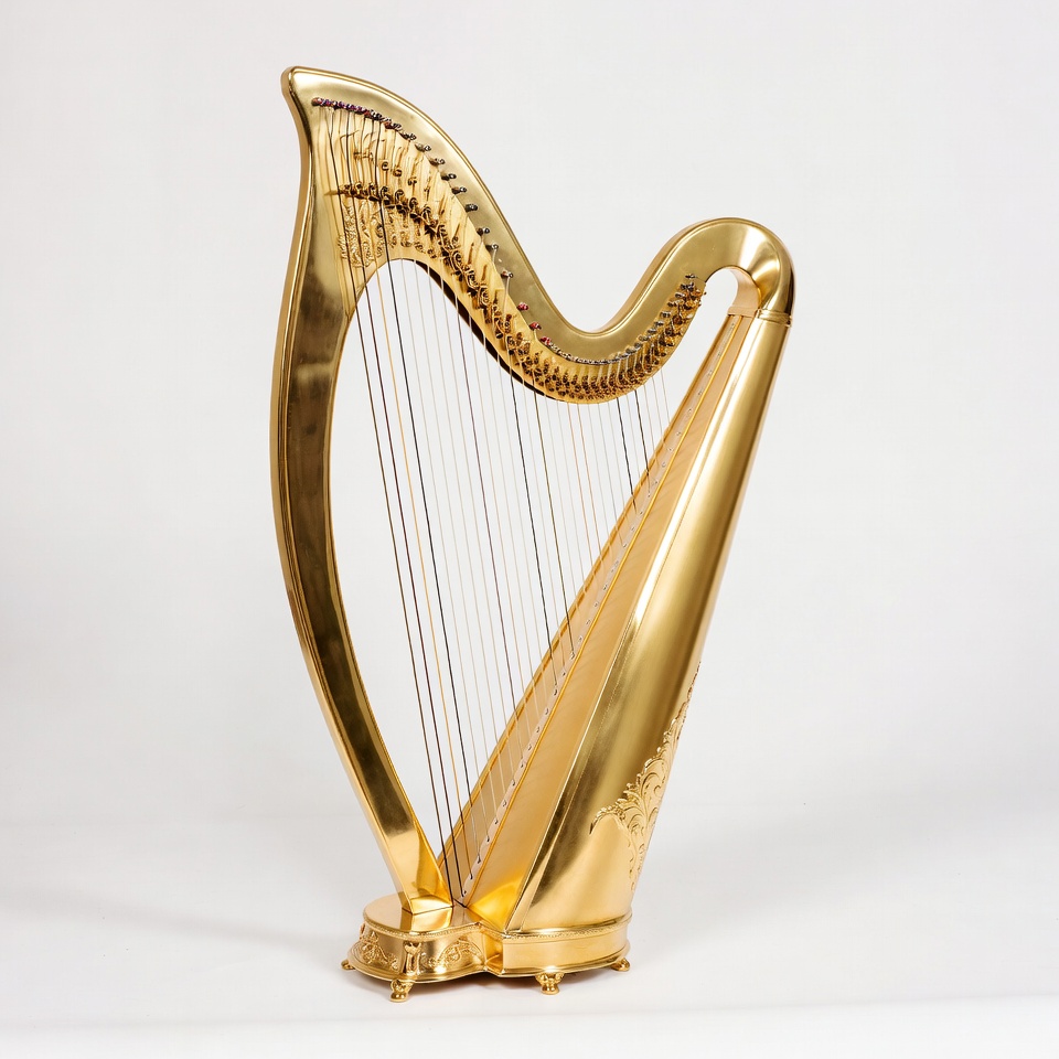 A shiny golden harp stands elegantly with its curved frame and numerous strings. The instrument features ornate detailing on the base and body. It is isolated against a plain white background.