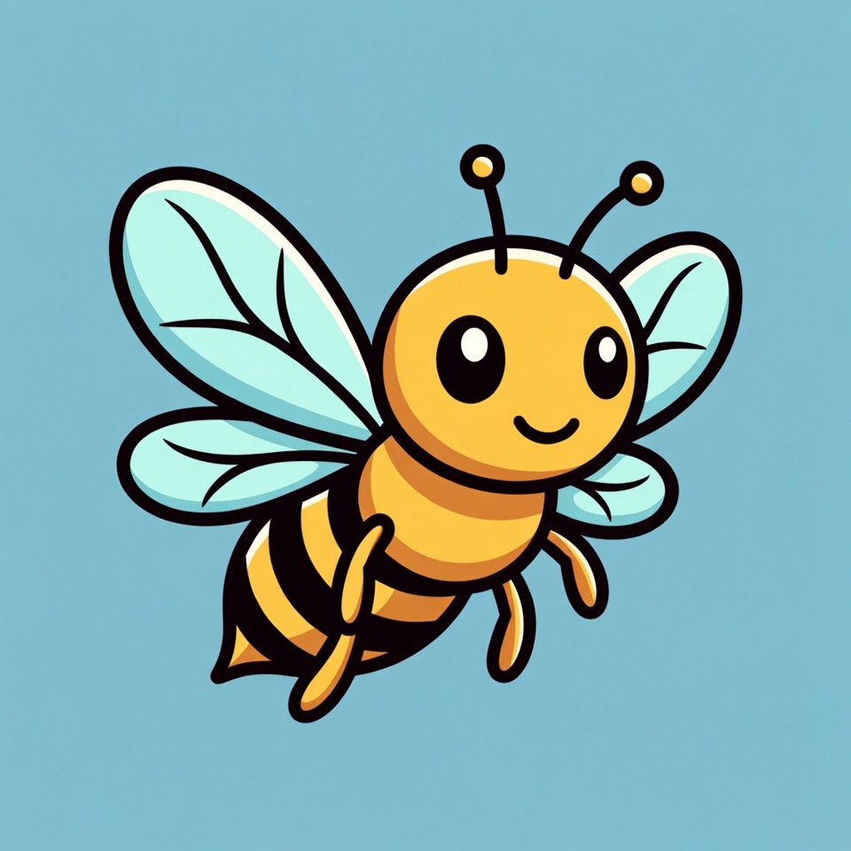 A vibrant cartoon bee with yellow and black stripes and large sparkling eyes flies against a solid blue background. Its translucent wings are spread wide, and it has a cheerful smile. The illustration features bold outlines and a playful, kawaii style.