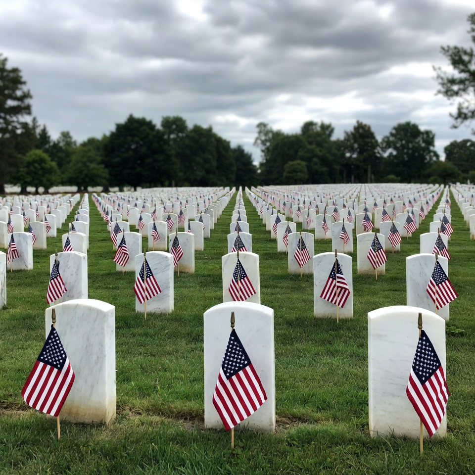Rows of white gravestones in a cemetery are adorned with small American flags planted in the grass. The scene is captured under a cloudy sky with trees visible in the background. The flags are evenly spaced across the expansive lawn.