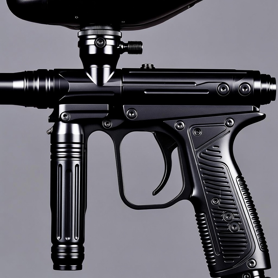 A sleek black paintball gun with a hopper on top is displayed against a plain gray background. It features a metallic barrel, ergonomic grip, and detailed trigger mechanism. The gun has a modern, tactical design with visible screws and rails.
