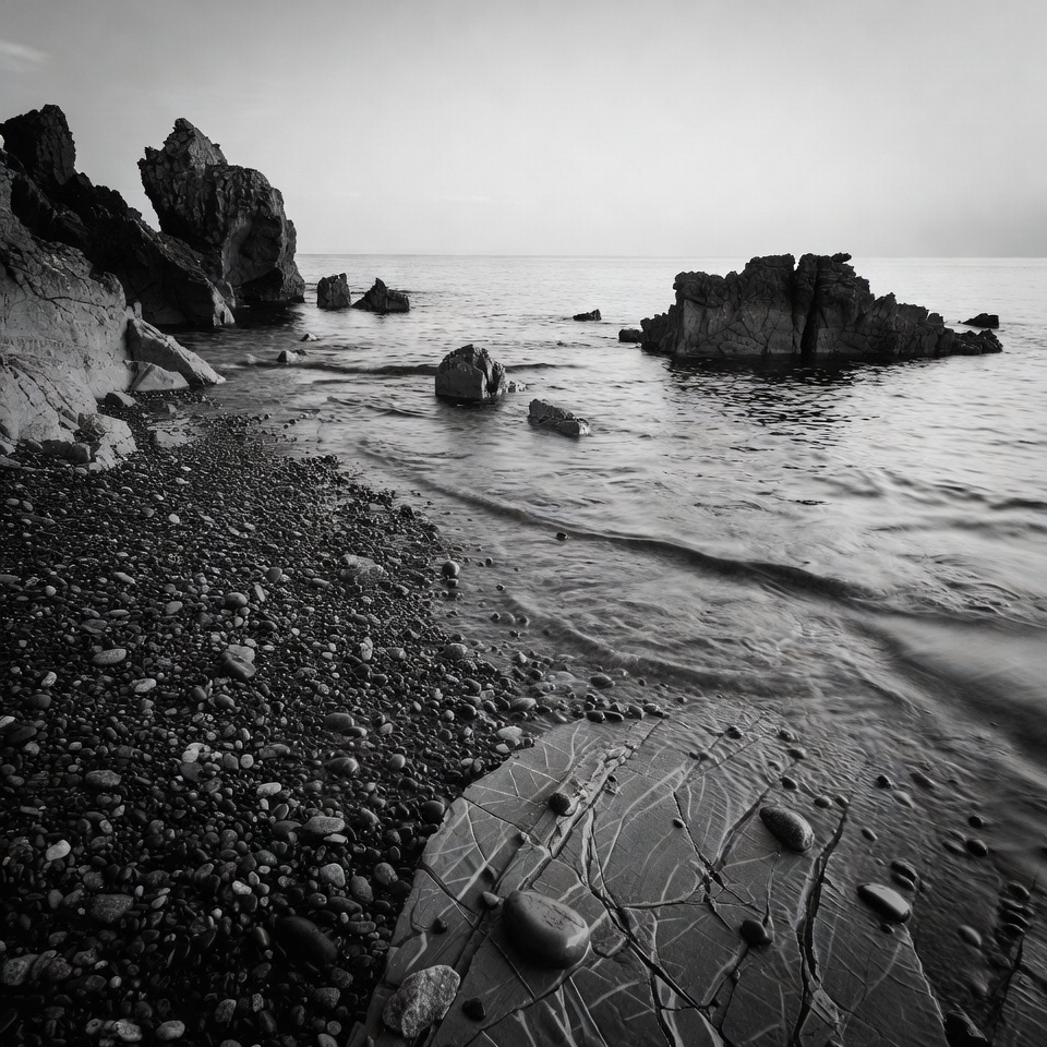 beach pebbles, black and white, calm sea, coastal rocks, gravel beach, isolated background, jagged rocks, misty horizon, monochrome landscape, nature photography, ocean waves, rock formations, rocky shore, sea rocks, seascape, shoreline, sunset beach, twilight sea, wave motion, pebble beach