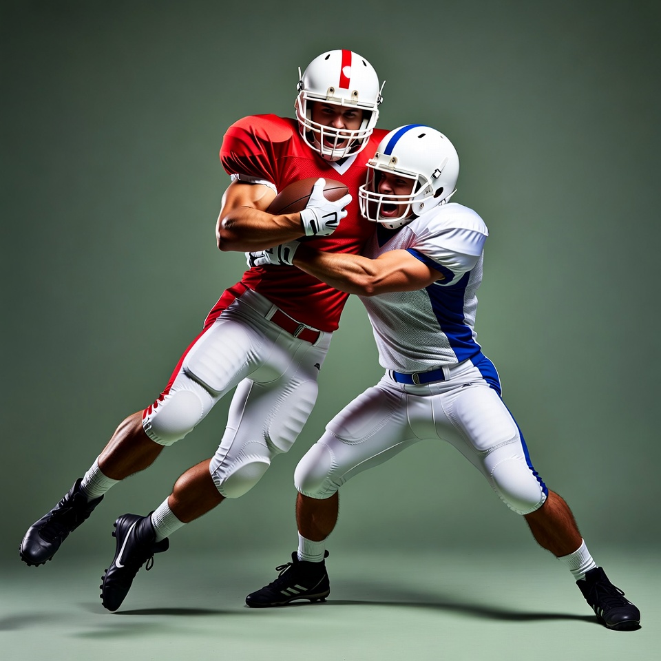 American football, White, action, athletes, blue jersey, cleats, collision, competition, dynamic pose, field, football ball, green background, grip, helmets, men, muscular men, pads, players, red jersey, sports, studio shot, tackle, tackling, football