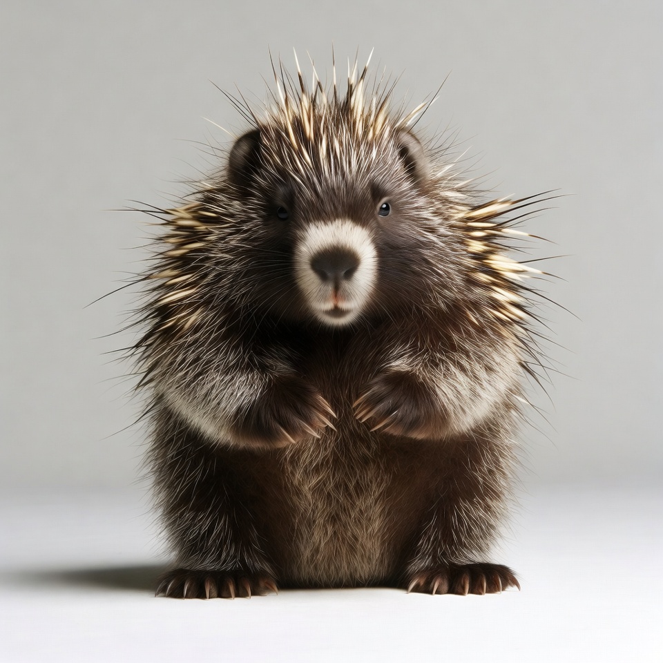 adorable animal, animal, animal portrait, brown hedgehog, cute hedgehog, fluffy hedgehog, gray background, hedgehog face, hedgehog standing, isolated background, paws, quills, small animal, spines, spiny animal, wildlife, hedgehog