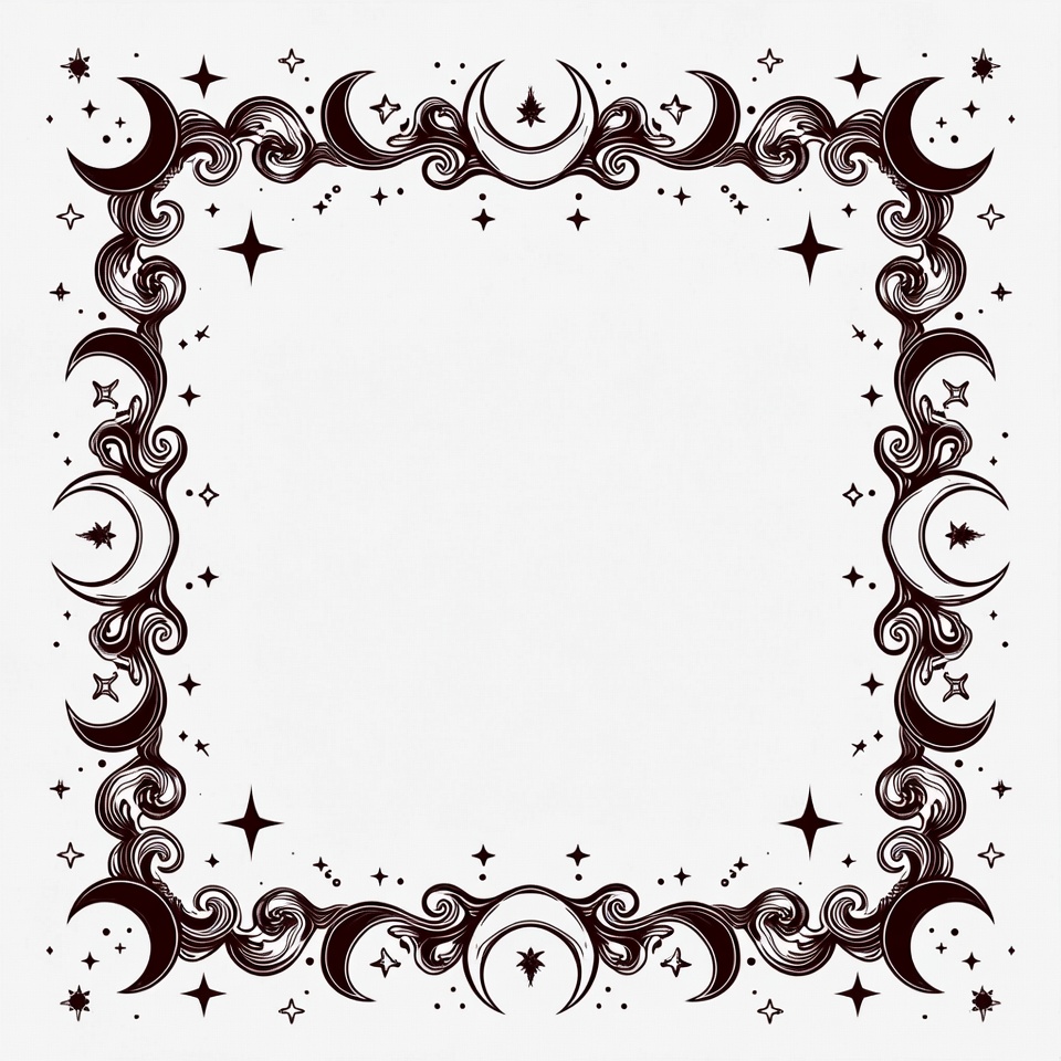 black outline, boho frame, celestial border, clipart, crescent moon, curved moons, decorative frame, elegant frame, empty frame, fantasy border, gothic frame, graphic element, illustration, isolated background, line art, lunar design, magic border, mystical design, night sky, ornate border, starry frame, stars, swirling patterns, vector art, white background, witchy frame, moon frame