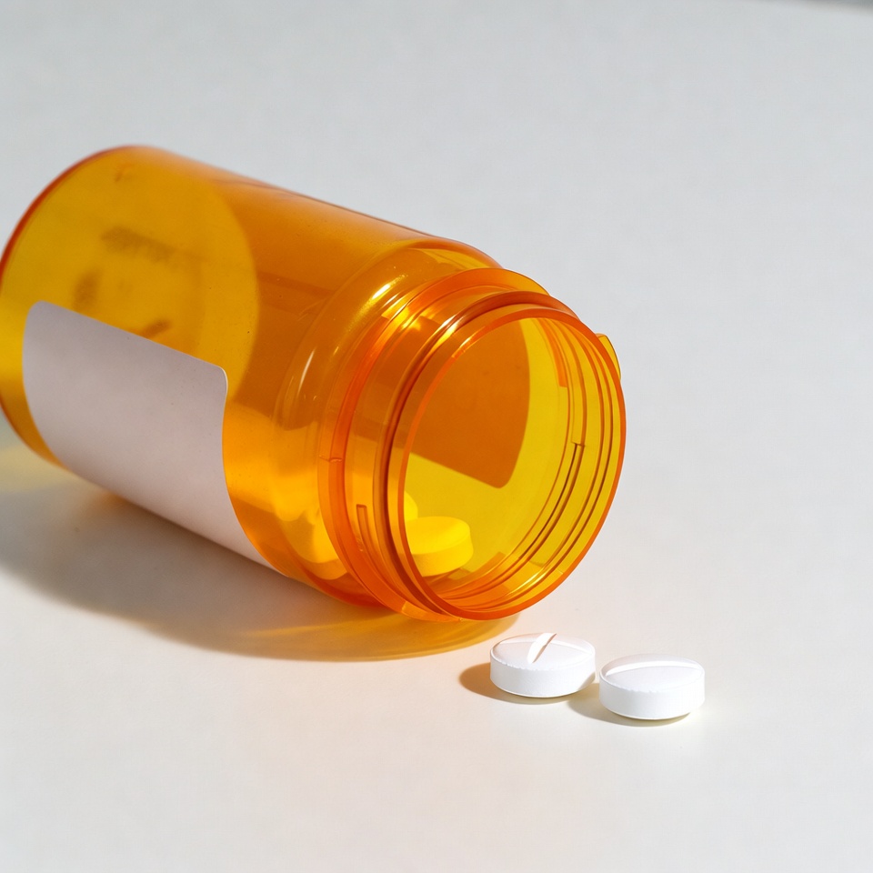 An orange prescription pill bottle lies on its side on a white surface with the cap off. White round pills have spilled out from the open bottle onto the table. A white label is attached to the side of the bottle.