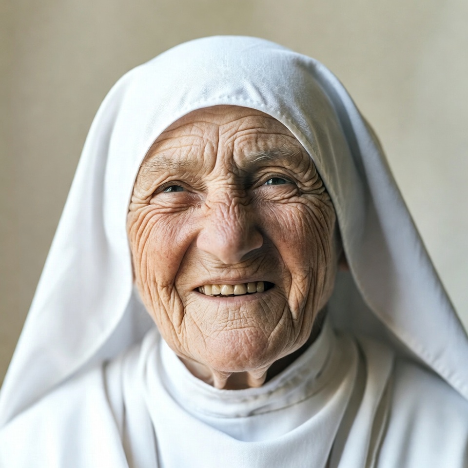 Catholic nun, White, close-up portrait, female, habit veil, happy elderly, joyful expression, nun, old woman, portrait, religious habit, senior citizen, smiling face, smiling nun, veil, white habit, woman, wrinkles, elderly nun