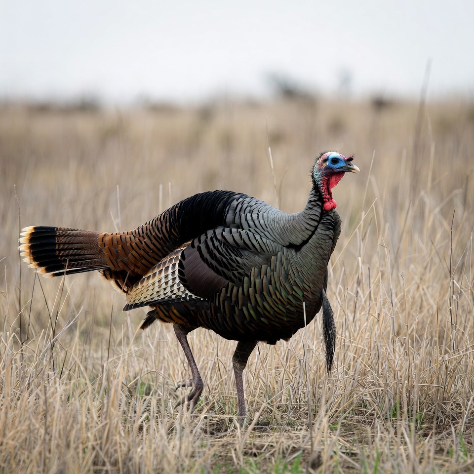 A male wild turkey stands in a dry grassy field with tall brown reeds. It displays its feathers with a mix of brown, black, and iridescent hues, featuring a red head and blue facial skin. The turkey looks alert with its tail partially fanned.