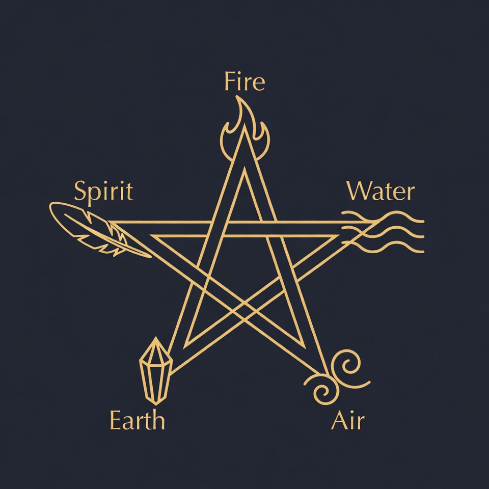 A golden pentagram outline on a dark background represents the four elements and spirit. Earth is symbolized by a crystal at the bottom left, fire by flames at the top, water by waves at the upper right, and air by swirling wind at the bottom right. A feather represents spirit at the upper left.