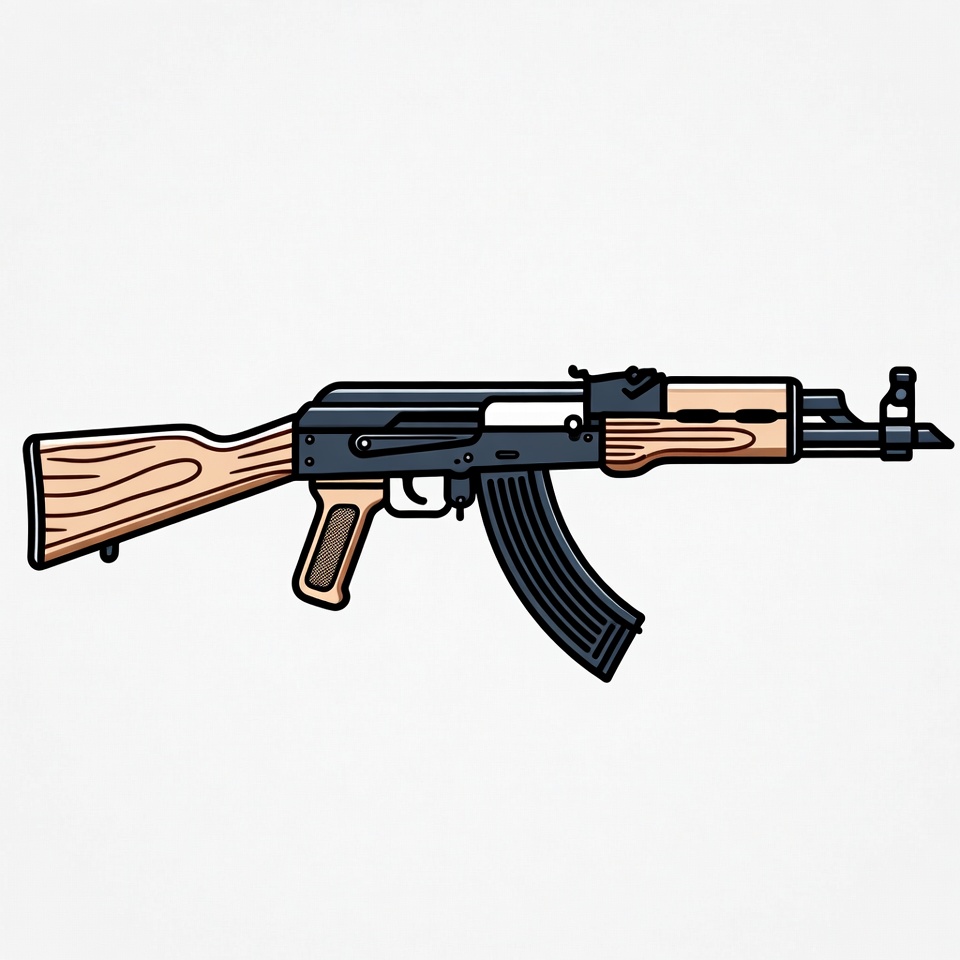 assault rifle, automatic weapon, barrel, clipart, firearm, gun, illustration, isolated background, line art, magazine, military, rifle, vector art, weapon, wooden stock, AK-47
