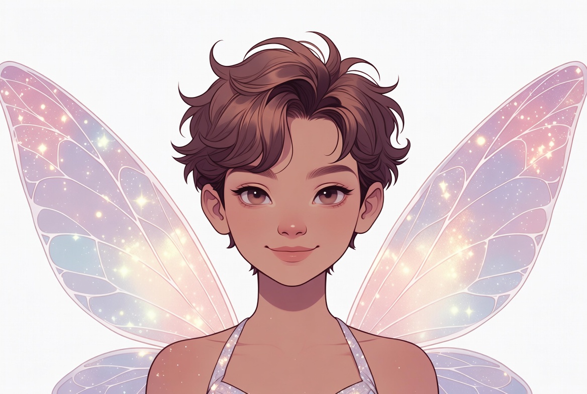 A cute anime-style girl with short curly brown hair and sparkling eyes smiles gently. She has large translucent pink and blue fairy wings extending from her back. She wears a white sleeveless top on an isolated white background.