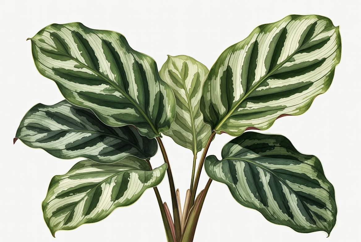 A detailed illustration of a variegated Calathea plant features large, striped leaves in shades of green and white. The leaves radiate from a central stem against an isolated white background. The intricate veining and color patterns are prominently displayed.