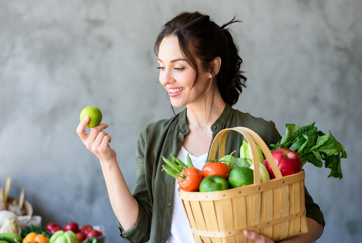 A smiling woman with brown hair in a ponytail holds a wicker basket overflowing with fresh vegetables including green apples, tomatoes, peppers, and greens. She picks up a green apple with her fingers while standing against a gray background. She wears a green jacket over a white top.