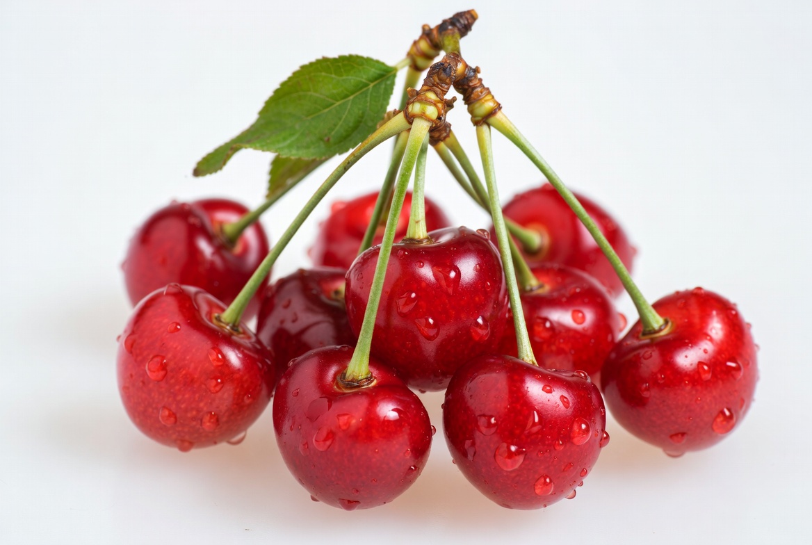 A cluster of ripe red cherries with green leaves and stems is arranged on a white background. Each cherry glistens with water droplets, highlighting their fresh and juicy appearance. The cherries are bunched together in a pyramid shape.