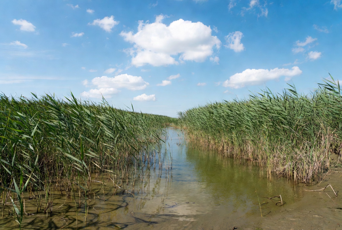 blue sky, calm water, clouds, environment, green reeds, landscape, marsh, natural scenery, nature, outdoor, river reeds, sky, swamp path, tall grass, vegetation, water channel, waterway, wetland, white clouds, reeds