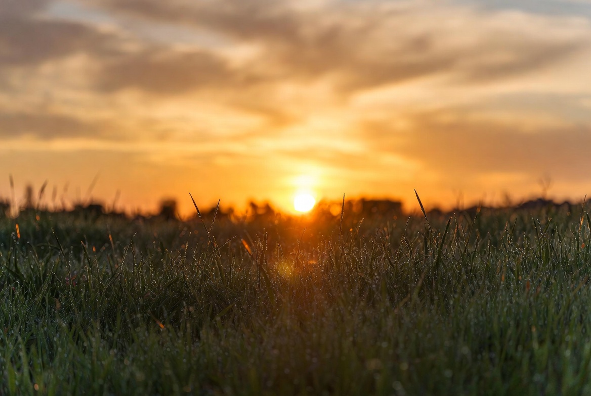 backlit sun, bokeh, clouds, dawn, dusk, field, foreground grass, golden hour, grass, horizon, landscape, meadow, nature, orange sky, outdoors, scenery, sunrise, tall grass, warm light, sunset