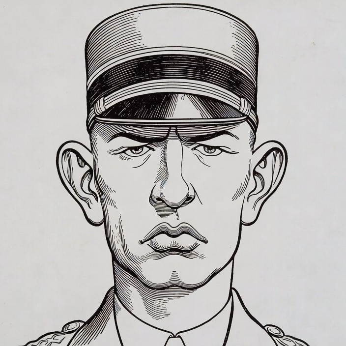 angry expression, black and white, cartoon man, epaulets, furrowed brow, glare, illustration, ink drawing, large ears, line art, male portrait, military cap, peaked cap, portrait, serious man, soldier hat, stern face, uniform, vintage style, man