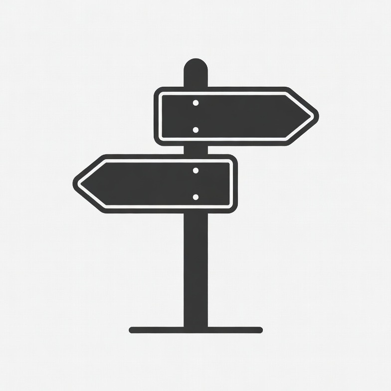 A simple black line art illustration of a directional signpost on a white background. It features a tall pole with two rectangular signs pointing in opposite directions, each with blank surfaces. The design is minimalist and isolated.