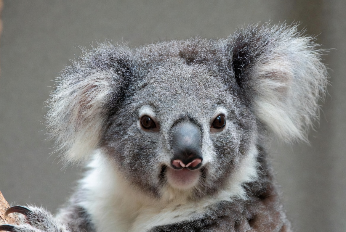 adorable, animal, australian animal, big eyes, black nose, close-up, cute koala, ears, face, fluffy fur, gray fur, isolated background, koala bear, marsupial, pink tongue, portrait, wildlife, koala