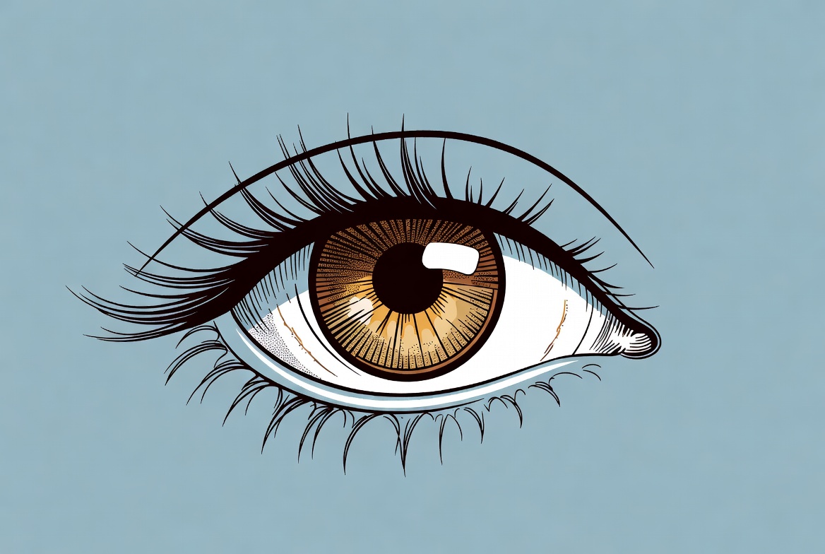 A close-up illustration of a human eye with a striking brown iris and long black eyelashes. The eye features a white sclera and detailed line art style on a light blue background. The artwork emphasizes intricate shading and realistic textures.