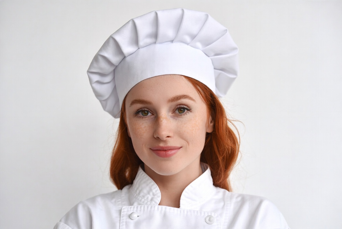 A young woman with long red hair and freckles wears a tall white chef's hat and matching chef's jacket. She stands smiling at the camera against a plain white background. Her green eyes and subtle makeup are visible in the close-up portrait.